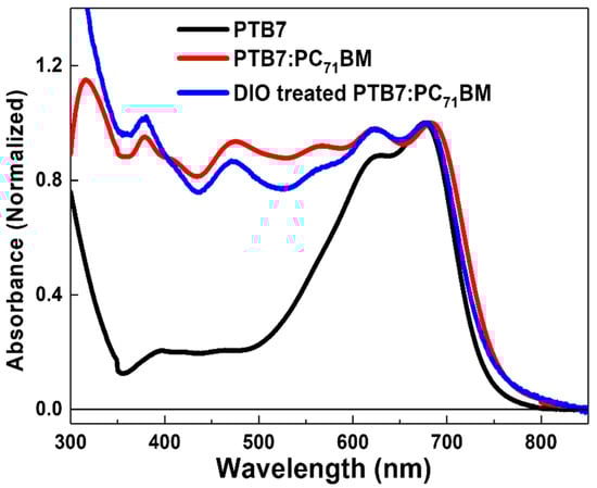 Normalized absorption spectra of neat PTB7 (polythieno[3,4-b]-thiophene-co-benzodithiophene) and PTB7:PC71BM ([6,6]-phenyl-C71-butyric acid methyl ester) blend films with and without DIO (1,8-diiodooctane) additive.