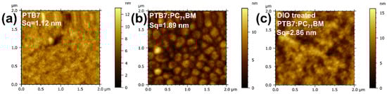 The AFM with the tapping mode was employed to characterize surface morphology of the neat PTB7 and PTB7:PC71BM devices without/with DIO treatment, as shown in Figure 2. For neat PTB7 film, the root-mean-square of the surface roughness (Sq) is ~1.12 nm. For the PTB7:PC71BM blend films, Sq of the blend films, without and with DIO additive, are 1.89 nm and 2.86 nm, respectively. Apparently, Sq of the blend films are larger than the neat PTB7 film, which could be attributed to phase separation in the blend films. It should be noted that it is not sufficient to judge the size of phase separation only by AFM data. The reasons are as follows: First, it is difficult to form a “really neat” donor or acceptor phase in the blend film. In many cases, the formed “donor phase” still contains some acceptors inside, and these acceptors will provide D/A interface within the “donor phase” for the exciton dissociation. Second, people cannot distinguish donor or acceptor compositions from AFM images directly. Sometimes, the observed domain size in AFM image may not reflect the size of separated phases in blend films. We also note that Sq increases after the additive of DIO, suggesting the addition of DIO could adjust surface morphology of PTB7:PC71BM blend films.