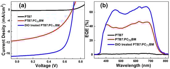 (a) The current density-voltage (J–V) and (b) external quantum efficiency (EQE) characteristics of the neat PTB7 and PTB7:PC71BM blend devices without and with DIO treatment.
