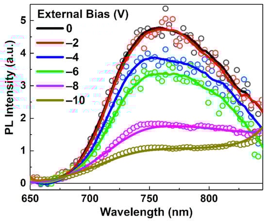 In this work, the bias-dependent PL spectrum of the neat PTB7 device was examined, as shown in Figure 4. It can be seen that the PL intensity of the neat PTB7 device does not change in the bias range of 0 to −2 V, suggesting the electric field of the device under working conditions has a weak influence on the dissociation of PTB7 excitons. To further examine the influence of high electric field on the dissociation of PTB7 excitons, the bias is further increased to −10 V. We observe PL intensity of neat PTB7 device decreases with the increase of bias when the bias is higher than −2 V. When the bias increases to −10 V, the PL intensity decreases to 20% of that at 0 V, suggesting 80% of PTB7 excitons are dissociated. We note that the bias of −10 V corresponds to the electric field of 1.1 × 108 V/m. Assuming this external electric field just overcomes the Coulomb attraction between the positive and negative charge of the charge pairs, a Coulomb binding energy of 0.23 eV can be deduced, see Supporting Information S1. The exciton binding energies of many classical conjugated polymers, such as P3HT (poly(3-hexylthiophene)) and PTB7, has been theoretically studied before. The exciton binding energy of PTB7 was estimated to be varied in the range of 0.22~0.49 eV depending on the constrained values of the dihedral angles, by first-principles calculations [34]. Our estimated value (~0.23 eV) is close to the calculated exciton binding energy of PTB7 at the dihedral angle of 0 (~0.22 eV) in that work. We also noted that the measured exciton binding energy of PTB7 is smaller than that of P3HT (0.28~0.75 eV) studied by theoretical calculations [34,35,36,37].