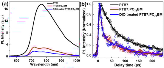 (a) Steady-state PL spectra and (b) TRPL (time resolved photoluminescence) kinetics of neat PTB7 and PTB7:PC71BM blend films at the indicated preparation conditions. The excitation wavelengths for steady-state PL and TRPL measurements were 532 nm and 400 nm, respectively. TRPL kinetics were probed at 780 nm with an excitation fluency of ~4 × 1010 photons·cm−2·pulse−1. The solid lines in (b) are fitting curves using double exponential decay functions.