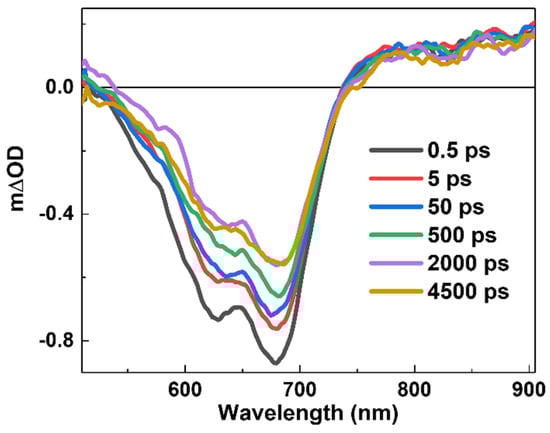 The representive TA (transient absorption) spectrum of DIO-treated PTB7:PC71BM film at indicated delay times under the 600 nm light excitation with an excitation fluency of 1.16 × 1013 photon·cm−2·pulse−1.