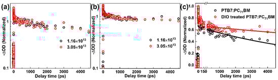 Normalized TA bleaching kinetics of PTB7:PC71BM blend films (a) without and (b) with DIO additive at 677 nm after photoexcitation at 600 nm under various photoexcitation fluencies (1.16 × 1013 and 3.05 × 1013 photon·cm−2·pulse−1). (c) Normalized TA bleaching kinetics of PTB7:PC71BM blend films without and with DIO additive under an excitation fluency of 1.16 × 1013 photon·cm−2·pulse−1. The solid lines are fitting curves by using single exponential decay functions.