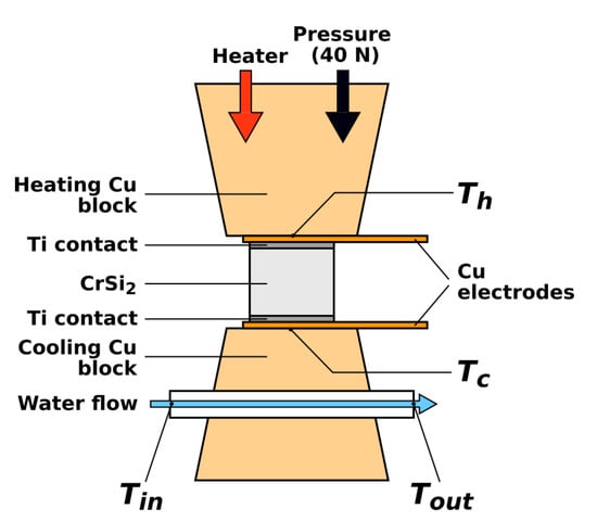 Scanning resistance measurement across the Ti/CrSi/Ti leg was realized using a home-made apparatus whose working principle was explained by Mengali et al. []. For performance characterization, the sample was cut in a rectangular shape with cross-section area of 0.60 cm × 0.60 cm = 0.36 cm and thickness of 0.49 cm. The open-circuit voltage (), total resistance (R), output power (), output heat flow (), and the maximum conversion efficiency () of the Ti/CrSi/Ti leg were measured under vacuum condition using an ULVAC Mini-PEM (full nomenclature of the symbols used in this article are shown in Table A1). A scheme of the set-up is shown in Figure 1 and is explained in more details in ref. []. The hot-side temperature of the leg varied from 320 K to 750 K using an electric heater, while the cold-side temperature was maintained at between 295 K and 307 K using water cooling. Cu foils on both sides of the sample were used as electrodes for electric measurement. In order to prevent large contact thermal resistance, the sample was pressed between two Cu blocks with an applied pressure of 40 N. For each temperature, the maximum power output was determined from the V-I plot. The ratio between the maximum output electrical power delivered to the load and the absorbed heat () at the hot-side was defined as the efficiency . Radiative and convective heat losses were considered as negligible, and was taken as the sum of and as given in relation (1).