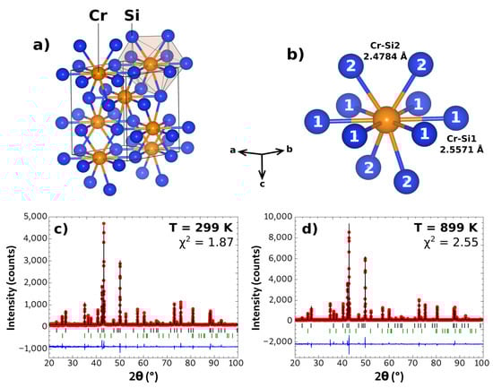 Scheme of the (a) crystal structure of CrSi and (b) coordination environment around Cr with six intralayer Si1 and four interlayer Si2 atoms. Rietveld refined XRD patterns of CrSi measured at (c) 299 K and at (d) 850 K. The experimental data were plotted in red symbols, the calculated pattern with a black line, and the difference with a blue line. The vertical ticks indicate the theoretical Bragg positions of CrSi (black) and AlO (green).