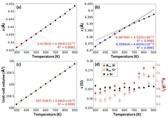 All the XRD patterns measured at temperature up to 899 K were fully indexed with the CrSi and AlO. After measurement and upon cooling, the structural parameter showed good reversibility and no trace of oxidation could be detected. The Rietveld refined XRD pattern at 899 K is shown in Figure 2d, while all the refined parameters and fit indexes (= /) are given in Table A2. The thermal evolution of the refined parameters a, c, x and are plotted in Figure 3. The thermal evolution of a was linear up to 899 K (Figure 3a) whereas it was only linear up to around 650 K for c (Figure 3b). Above this temperature, c entered a new linear regime characterized with a smaller slope coefficient of 3.3 × 10 Å K compared to 4.6 × 10 Å K below. Such a discontinuity was already reported at a similar temperature by T. Dasgupta et al. []. Despite this, the thermal evolution of the unit-cell volume was well fitted with a linear function up to 899 K (Figure 3c). Within the experimental uncertainties, the positional parameter x remained constant with an average value of 0.167 ± 7, meaning that all interlayer Cr–Si bond distances remained equivalent on the whole temperature range studied. As expected for conventional materials, globally increased with the temperature for both Cr and Si atoms.