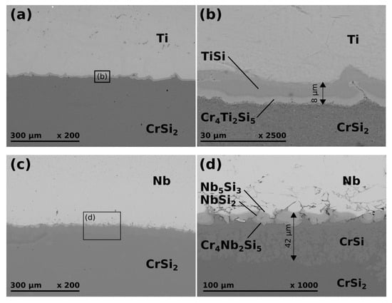 SEM back-scattered images showing the microstructure of the contact interface after SPS sintering. The images (a,b) and (c,d) show the Ti–CrSi and the Nb–CrSi interfaces, respectively, at different magnifications. The chemical composition of the different phases was determined by EDS measurements.