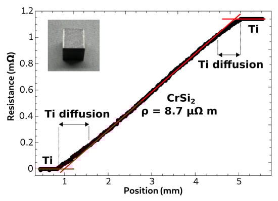 The electric contact resistance of the junction between the thermoelectric material and the metal layer is an important characteristic that should be minimized in order to increase its conversion efficiency. Figure 5 shows the evolution of the total resistance across the length of the Ti/CrSi/Ti leg at 298 K. The profile was characteristic of negligible contact resistance (<1 cm) as no visible jumps could be detected with this measurement resolution at the interfaces. The electrical resistivity of the TE material was estimated at 8.7 m from the slope of the linear section between 1.5 and 4.5 mm which was consistent with literature values around 10 m reported for CrSi[]. However, it should be noted that the resistance profile started to deviate significantly from the linearity on both sides of the leg at a distance of about 500 m from the junctions. This was attributed to the diffusion of Ti inside CrSi, resulting in the formation of the solid solution TiCrSi clearly evidenced by SEM/EDS analyses. Ti is known to act as an efficient p-type dopant when substituting Cr in CrSi, which explains the local decrease of the electrical resistivity in those areas [].