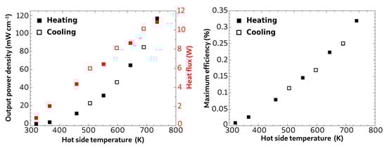 Figure 6a shows the maximum power output generated and the heat flux leaving the Ti/CrSi/Ti legs for different conditions. The filled and empty signs correspond to a measurement realized during the heating and cooling steps, respectively, showing the good reversibility of the measurement and, thus, the good thermal stability of the TE leg. logically increased with an increasing as a direct consequence of the voltage circuit () increase due to the Seebeck effect. The maximum value reached about 120 mW cm for a hot-side temperature of 736 K and of 427 K. Similarly, increasing results in a linear increase of going from 0.8 W to 11 W as the hot-side temperature increased from 327 K to 736 K. The measured values awee high compared to reported legs composed of optimized BiTe or PbTe because of the intrinsically higher thermal conductivity of pristine CrSi (>10 W m K compared to <4 W m K at 300 K). The doping or nanostructuration of CrSi should result in a significantly decreased and, thus, higher performances [,].