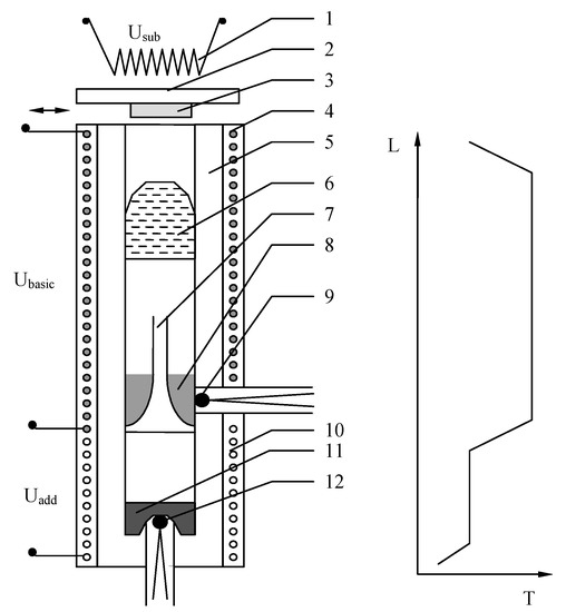 Scheme of reactor layout (left) and temperature distribution in it (right): 1—substrate heater; 2—holder of substrates; 3—substrate; 4—heater of the main steam source; 5—metal screens for leveling the temperature gradient; 6—damper divider; 7—capillary; 8—main load; 9—main charge thermocouple; 10—additional source of steam; 11—additional source of thermocouple; 12—heater of an additional source (Usub—substrate heater voltage, Ubasic and Uadd—main and additional heaters voltage of the reactor chamber walls, L—the length of the reactor zone, T—temperature).