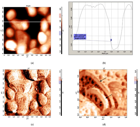 Figure 1 shows the data of lateral force microscopy (LFM) when compared with the data of topography images obtained in contact mode. Figure 2a shows an overview of the surface of the photosensitive polycrystalline layer Pb1−xCdxSe <I> (x = 0.18) after the cross-section of several grains by plowing (force) lithography. As one can see from Figure 2a, the sample layer consists of grains with a size of about 0.66..2.5 μm. Where the surface of the grains was developed, nanoprotrusions (specific formations) are observed (Figure 2b). According to the LSM method, such inclusions are also detected (Figure 2c,d). As one can with simultaneous registration with LFM, specific formations on the surface of the grains were found. Such specific formations (diameter ~ 100..200 nm, height ~ 5..10 nm) covered almost the entire surface of the grains with an oxidizing coating. The deviation of the height of these formations was relatively small in comparison with the grain sizes of the polycrystalline layer. Since the roughness within the individual grain was less than 5–6 nm, it is supposed that such formations are products of the release of metals from the grain and an almost formed shell in places where the seepage process is still possible. The formation of oxide in these places leads to the appearance of a system of nano-hills (Figure 2). At the same time, high structural perfection inside the grain is maintained.