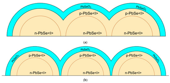 In the last several decades, a research area based on polycrystalline chalcogenides [22,23,24,25,26,27,28,29,30,31,32,33] and their solid solutions for IR photodetectors and emitters [21,22,23,24,25,26] has been successfully developing. The optimization of technological processes is accompanied by the sensitization of materials and the creation of protective oxide shells [28,29,30,31,32] consisting of different chemical compounds, namely PbOx, PbSeO3, bi- and tetra-oxyselenites and oxyselenates (2PbO∙PbSeO3, 4PbO∙PbSeO3) [29]. The photosensitive properties of the layers depend significantly on the composition of the oxide phase.