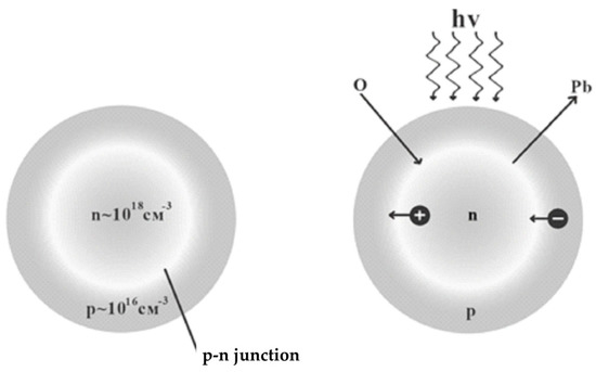 Thus, the layer under the oxide coating possesses p-type conductivity. Deeper towards the center of the grain, the conductivity type changes, and the central (core) region itself has n-type conductivity. This structure has an internal p–n junction. Accordingly, it is expected that it will have photosensitive properties in the atomic–molecular design of the structure of the intragranular space, with a break in the percolation current flow in the n-regions. In practice, this is created by the through formation of p-layers at grain boundaries (Figure 7a).