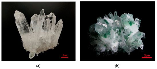 Quartz, also called ‘rock crystal’, is widely distributed on the earth and has broad application in many industries. High-quality quartz with various colors can be regarded as a gemstone and has a high share on the jewelry market. In addition, quartz can also be used as piezoelectric material and optical material, which require high clarity. Different types and amounts of impurities are common in natural quartz. Therefore, clear quartz is often synthesized by hydrothermal synthetic technique in the industry. This technique simulates the crystallization process of natural quartz in the hydrothermal fluid. It can be dated back to the 19th century and has been continuously improved ever since. The market demand also accelerated the development of this synthetic technique [1,2,3,4,5,6,7,8,9,10]. Nowadays, different kinds of colorless or various color quartz can be synthesized by the hydrothermal method.