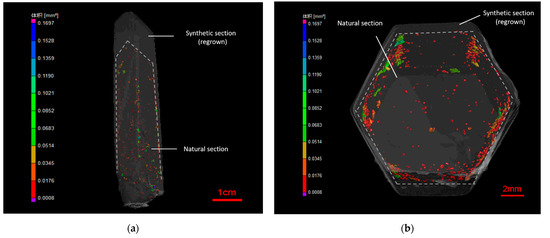 The 3D images of different sections of regrown quartz crystal show different microstructure characteristics, which were obtained by the three dimensional computed tomography system and the intelligence recognition function of visual imaging software. From the side view of the 3D image (Figure 3a), there are many micron- to millimeter-sized pores in the natural section, with the volume from 8 × 105 μm3 to 0.17 mm3. However, the regrown section has much lower porosity and rare pores in it, in which the pore volume is under 6 × 104 μm3. From the top view of the 3D image (Figure 3b), most pores in investigated samples are distributed along or close to the interface of the two sections. These pores in the regrown quartz crystal can be vacuum or filled with gas, fluid, or gas-liquid phases.