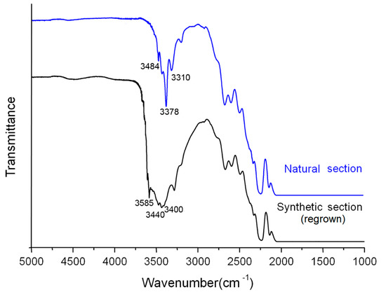 The distinction on infrared spectra between the natural section and the synthetic section mainly shows in the regions from 3300 to 3600 cm−1. The natural section shows absorption peaks at 3310, 3378, and 3484 cm−1, while the synthetic section displays obvious absorption at 3400, 3440, and 3585 cm−1 (Figure 4).