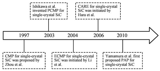 Single-crystal SiC is a typical hard and brittle material, and due to its strong chemical inertness, it does not react with acid and alkali at room temperature, which makes the precise polishing of single-crystal SiC particularly difficult. The conventional mechanical polishing often introduces scratches and subsurface damage on the SiC surface, so it is generally not used as precision polishing. In the final stage of the SiC wafer fabrication process, a CMP process using a slurry containing chemical and silica abrasives was developed to remove subsurface damage and reduce surface roughness, and it is now industrially used. However, due to the low polishing efficiency of CMP and the difficulty of its slurry waste disposal treatment, other precision polishing technologies for single-crystal SiC were developed, such as PCMP, which introduces irradiation and TiO2 photocatalyst into CMP; PAP, which combines atmospheric-pressure plasma irradiation and soft abrasive polishing; ECMP, which combines the low-voltage electrochemical corrosion of the workpiece with soft abrasive polishing; and CARE, which uses a metal catalyst to accelerate the chemical dissolution of single-crystal SiC in the absence of abrasive conditions. Figure 1 presents the development of precision polishing technology of single-crystal SiC, clearly showing its growth in popularity.