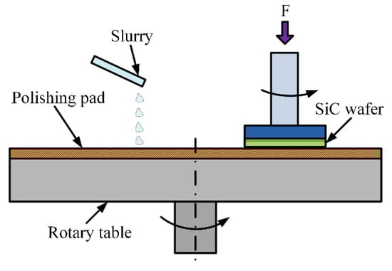 CMP, also known as thermal oxidation polishing, utilizes MP in conjunction with chemicals to enhance the MRR and improve surface quality [20]. Figure 2 illustrates the schematic of a typical CMP process [21]. The SiC wafer, which is fixed on the carrier, and the polishing pad move relative to each other under a certain pressure in the polishing slurry. Then a soft layer is formed by reactions between the oxidant of the polishing slurry and the surface of the specimen under the friction. After the soft layer is removed mechanically by the abrasive particles, a flattened SiC surface can be obtained. Therefore, it is a synergy result between chemical reactions and mechanical removal. The main factors affecting the MRR and surface roughness of CMP are the pH of slurry, abrasive, oxidant, catalyst, and so forth.