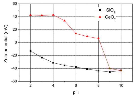 The zeta potentials of CeO2 and SiO2 particles in the presence of KMnO4 [23].