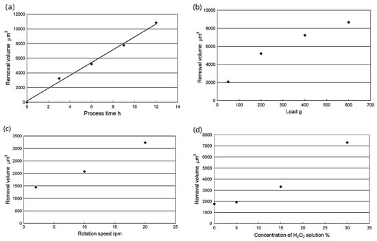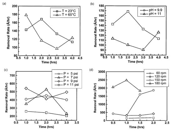 The effects of (a) temperature, (b) slurry pH, (c) applied pressure, and (d) polishing rotation rate on the MRR of 4H-SiC [24].