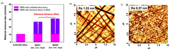(a) The MRR of a 6H–SiC surface polished with a colloidal silica slurry and MAS; the AFM images and roughness values of a 6H–SiC surface polished with (b) a colloidal silica slurry and (c) MAS (diamond concentration: 25 g/L) [25].