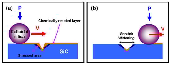 Probable mechanism of scratch removal in colloidal silica slurry CMP: (a) chemically reacted surface of SiC; (b) the SiC surface after chemically reacted layer removed by colloidal silica [26].