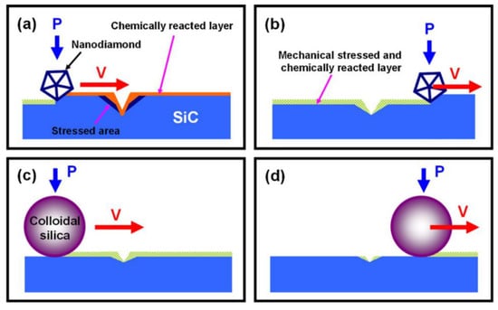 Lee [25] used a mixed abrasive slurry (MAS) with a conventional colloidal silica slurry and nanodiamond to polish 6H-SiC. Figure 5 shows that a higher MRR was 0.32 μm/h, and a smooth surface with lower Ra = 0.27 nm was obtained when the concentration of the diamond abrasive was 25 g/L. Subsequently, Lee [26] focused on the mechanism of CMP SiC by alkaline MAS. CMP results showed that a higher MRR and lower surface roughness could be obtained better by MAS than by the colloidal silica slurry. As the concentration of the diamond abrasive increased, the MRR also increased. However, when the concentration was too high, it led to poor surface roughness. Figure 6 and Figure 7 show the probable scratch removal mechanism of the colloidal silica slurry and MAS, respectively. First, the mechanically stressed areas by mechanical polishing reacted with the CMP slurry as shown in Figure 6a. Then, the colloidal silica abrasives removed the chemically reacted surface of SiC. However, it was likely that higher MRR in the stress concentrated in areas around scratches and the lower MRR in relatively low stressed areas make the scratches on SiC widened from Figure 6b. As shown in Figure 7a,b, the diamond abrasives mechanically removed SiC and induced stress on the relatively low stressed surface of SiC. The stressed areas reacted more readily with slurry chemicals and were easily smoothed with colloidal silica abrasives in Figure 7c,d. Therefore, the MAS can remove the relatively low stress area faster than the colloidal silica slurry. The high MRR of SiC in the low stressed areas effectively reduced the depth of scratches.