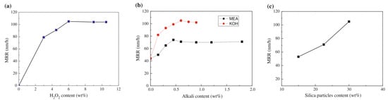 The relationship between the MRR of a SiC wafer and (a) H2O2 content, with 0.6 wt% KOH and 30 wt% silica particles; (b) different alkali (KOH or MEA) contents, with 6 wt% H2O2 and 30 wt% silica particles; and (c) silica particle content, with 0.6 wt% KOH and 6 wt% H2O2 [10].