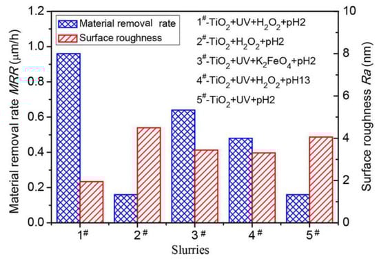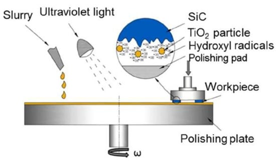 Ohnishi [35] added 0.3 wt% TiO2 to the alkaline slurry with SiO2 and found that the polishing efficiency of 4H-SiC could be improved significantly by UV irradiation, which was caused by some chemical substances with strong oxidation produced by the photocatalytic reaction of TiO2 particles under UV irradiation, promoting the oxidation of the SiC surface.