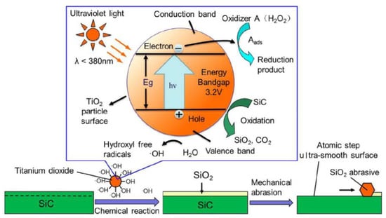 Ishikawa [34] used TiO2 as a photocatalyst to conduct surface modification of single-crystal SiC at room temperature. It was found that with a TiO2 photocatalyst, •OH with a strong oxidizing ability could be produced, which could promote the oxidation efficiency of SiC into SiO2. The reaction was as follows: