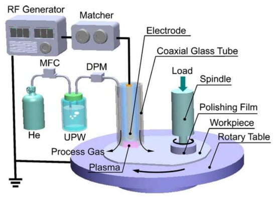 PAP is a precise polishing technology combining atmospheric plasma irradiation with soft abrasive polishing. Figure 13 shows a schematic of the PAP setup. This setup consists of separately installed plasma generation and mechanical removal parts. The oxide layer can be formed on the single-crystal SiC surface by the atmospheric plasma irradiation. An atomic smooth single-crystal SiC surface without internal stress and SSD can be obtained after the oxide layer is removed by the mechanical removal parts.