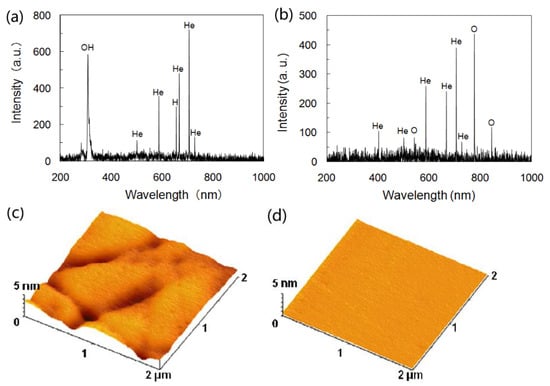 Emission spectra of the plasma: (a) water vapor plasma, (b) oxygen plasma; AFM images of 4H-SiC: (c) unprocessed surface at 0.495 nm rms, (d) surface after PAP at 0.060 nm rms [12].