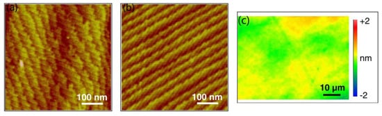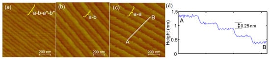 During the oxidation of 4H-SiC by plasma, Deng [45] found that the content of water vapor had a great influence on the density of •OH. When the content of water vapor in He was about 200 ppm, the concentration of •OH was the largest and the oxidation rate was the highest. When the concentration of water vapor was greater than 200 ppm, the concentration of •OH decreased with the increase in water vapor content. This was because at high water vapor content, the excited state of •OH was effectively quenched, which greatly reduced its density. As shown in Figure 18, three types of step/terrace structure were produced after 4H-SiC polished by the CeO2 slurry: a-a, a-b, and a-b-a*-b*. When the polishing rate (Rp) was lower than the oxidation rate (Ro), the a-b-a*-b* type was generated (Figure 18a). When the polishing rate was comparable to the oxidation rate, the a-b-a*-b* type changed to the a-b type, as shown in Figure 18b. In the case of the polishing rate becoming greater than the oxidation rate, a uniform a-a type was generated [46] and the step height was 0.25 nm (Figure 18d).