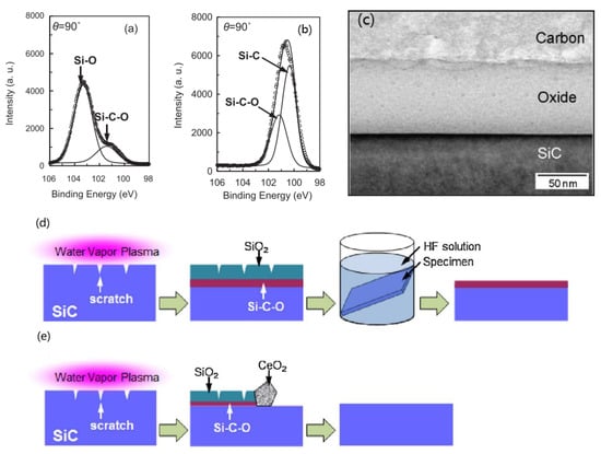 ARXPS spectra (Si2p) of 4H-SiC surface (a) by water vapor plasma irradiated, (b) the surface in (a) after HF dipping, (c) XTEM image of a surface irradiated by water vapor plasma for 1 h, probable mechanism of scratch removal (d) by plasma oxidation and HF dipping and (e) by PAP using ceria abrasives [41].