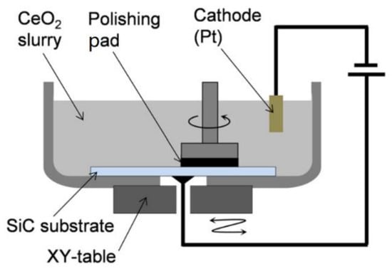 - Deng, H.; Hosoya, K.; Imanishi, Y.; Endo, K.; Yamamura, K. Electro-chemical mechanical polishing of single-crystal SiC using CeO2 slurry. Electrochem. Commun. 2015, 52, 5–8. [Google Scholar] [CrossRef]