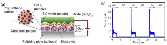 As shown in Figure 21a, a novel polishing slurry containing self-made CeO2-polyurethane(PU) core-shell particles and deionized water was used for electrochemical mechanical polishing of 4H-SiC in Murata’s report [49]. It was found that when continuous bias was applied, the scratches were easily introduced to the polished surface, and the surface roughness Ra increased from 4.38 nm to 6.61 nm owing to the oxide film remaining on the processed surface, which was caused by the higher oxidation rate than the oxide removal rate. On the other hand, a smooth surface can be obtained by applying periodic bias. Based on Faraday’s law, an optimal electrolysis condition of E = 10 V, Ton:Toff = 2.5 min:7.5 min was obtained, as shown in Figure 21b. Under this condition, it was estimated that the oxide rate of SiC was 3.70 μm/h, which was close to the removal rate of a soda lime glass by using CeO2/PU core-shell particles under the same condition, but the definite MRR was not given. The surface roughness Ra decreased from 5.43 nm to 0.51 nm after 90 min ECMP.