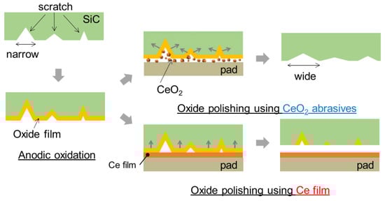 To improve the surface roughness of 4H-SiC after ECMP, Murata [53] applied a periodic bias in ECMP by a Ce thin film with holes and obtained the optimal electrolytic parameter with a duty ratio (Ton:(Ton + Toff)) of 45%, a duty period (Ton + Toff) of 10 min, and an applied voltage of 10 V. A smooth scratch-free surface with a roughness Ra of 0.49 nm was obtained after ECMP by the Ce thin film under the optimal electrolytic parameter. The ECMP using CeO2 abrasives was also conducted for comparison with the ECMP using a Ce thin film. It was found that the surface roughness of the ECMP using a thin film under the same conditions was much better than that of the ECMP using CeO2 abrasives, while the MRR was not as good as that of the latter, which was due to the difference in the oxide removal mechanism. As shown in Figure 22, the CeO2 particles in the ECMP contacted and removed the oxide scratches, resulting in wider scratches. Such scratch widening behavior in single-crystal SiC polishing using a CeO2 polishing slurry was also reported by Deng [54]. In contrast, only the oxide at the point where the film contacted can be removed in ECMP using a Ce thin film. Therefore, the scratch would not be widened during processing.