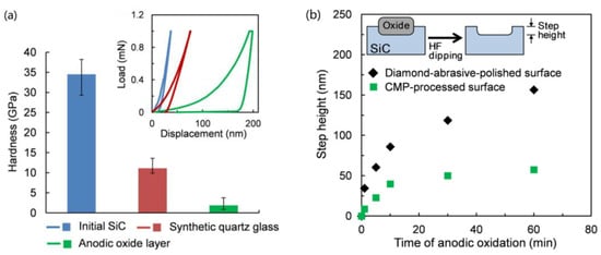 (a) Hardness measured by the nanoindentation method, (b) thickness of anodically oxidized SiC with different durations [15].
