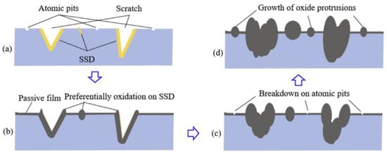 Liu [55] conducted an experimental study on the occurrence and development of local oxidation in the anodic oxidation of 4H-SiC using a three-electrode system and the electrolyte of KCl solution. Since anodic oxidation was based on the transfer of electrons from the electrolyte to the electrolyte/silicon carbide interface, local oxidation preferentially occurred in the charge carrier- rich areas, such as damage and doping regions. It was found that the anodic oxidation had a high priority around the damaged areas. Along the scratched areas, a large amount of covalent bonds formed by carbon atoms and neighboring silicon atoms was broken, which led to the creation of a large number of dangling bonds, free electrons, and holes. Therefore, the scratch area had a high density of carriers, which greatly improved the conductivity of these areas. Anodic oxidation of the damage-free areas occurred randomly due to the random distribution of doping sites in the SiC wafer.