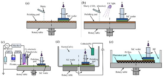 - Osamu, O.; Toshiro, D.; Syuhei, K.; Tsutomu, Y.; Michio, U.; Tao, Y.; Isamu, K.; Koichiro, I.; Hideo, A. Effects of atmosphere and ultraviolet light irradiation on chemical mechanical polishing characteristics of SiC wafers. Jpn. J. Appl. Phys. 2012, 51, 05EF05. [Google Scholar] [CrossRef]
