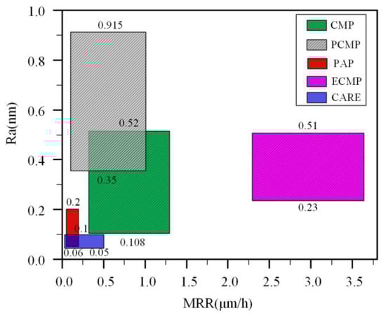 The surface quality of single-crystal SiC obtained by PAP is high, while the MRR is low (<0.2 µm/h). Moreover, its process operation is poor due to the complex polishing system, plasma generation, and irradiation devices.