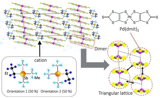 An isostructural series of anion radical salts of a metal complex Pd(dmit)2 (dmit = 1,3-dithiol-2-thione-4,5-dithiolate), β′-EtxMe4−xZ[Pd(dmit)2]2 (Et: C2H5, Me: CH3, Z = P, As, and Sb; x = 0–2), are Mott insulators at ambient pressure [3]. In crystals of β′-Pd(dmit)2 salts with the space group C2/c, Pd(dmit)2 anion radicals are strongly dimerized to form a dimer with spin 1/2, [Pd(dmit)2]2− (Figure 1). The dimers are arranged in an approximately isosceles-triangular lattice parallel to the ab plane, which leads to a frustrated S = 1/2 Heisenberg spin system. The anion radical layers and the non-magnetic cation layers are arranged alternately along the c axis. The ground state of the Pd(dmit)2 salts is found to change among antiferromagnetic long-range order (AFLO), QSL, and charge order (CO), depending on the anisotropy of the triangular lattice that can be tuned by the choice of the counter cation [3]. The cation effect on the degree of frustration is associated with the arch-shaped distortion of the Pd(dmit)2 molecule [4]. The QSL phase found in β′-EtMe3Sb[Pd(dmit)2]2 is situated between AFLO and CO phases [5,6].