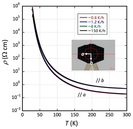 The electrical resistivity is sensitive to the crack formation. In addition, when the emergence of an electronic phase depends on the cooling rate as is the case of θ-(BEDT-TTF)2RbZn(SCN)4 (BEDT-TTF = Bis(ethylenedithio)tetrathiafulvalene) that possesses the charge-glass-forming ability, the electrical resistivity can detect a change of the electronic state [22]. Figure 2 shows temperature-dependent resistivities along the a and b axes measured with four different cooling rates, −0.6, −1.2, −6, and −150 K/h in this order. β′-EtMe3Sb[Pd(dmit)2]2 was a semiconductor and the resistivity became too high to measure below 28 K. Anisotropy within the ab plane was small, including the activation energy (~41 meV). As shown in Figure 2, temperature-resistivity curves for each cooling rate overlap almost completely, which means that there was no cooling rate dependence. In addition, no crack formation (indicated by an abrupt jump of the resistivity) and no thermal cycle dependence was observed.