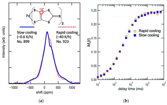 13C-NMR of β′-EtMe3Sb[Pd(dmit)2]2 at 5 K with rapid and slow cooling rates. (a) Spectra; and (b) nuclear magnetization curves.