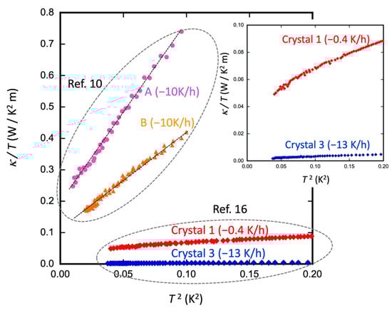 In this sense, the results of this work suggest that further analysis is necessary before concluding that the cooling rate is an essential experimental condition. Let us reconsider two different sets of thermal conductivity data from [10,16] (Figure 5). Measurements with different cooling rates indicated that the slower cooling rate gave the larger κ and finite κ/T [16]. However, even with the slowest cooling rate (−0.4 K/h), the κ values are much smaller than the first reported ones [10]. That is, the large-κ data have never been reproduced. In addition, the measurements in [10] performed with the rapid cooling rate of −10 K/h show larger κ values than those for Crystal 1 measured with the slowest cooling rate of −0.4 K/h in [16]. This is quite puzzling and suggests that the cooling rate is not essential.