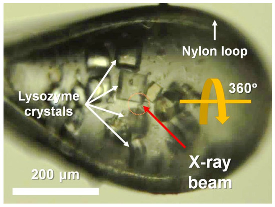 Similar-sized lysozyme crystals were obtained using the batch method, which is used widely in SX [29,31]. After being soaked in the cryoprotectant solution, multiple crystals were mounted on a goniometer maintained at 100 K in a nitrogen stream (Figure 1). The CryoLoop containing the lysozyme crystals was aligned such that multiple crystals were exposed to the X-ray beam as the CryoLoop was rotated by 360° during the data collection process (Figure 1).