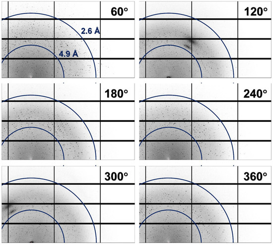 Magnified views of multicrystal diffraction patterns recorded at oscillation angles of 60°, 120°, 180°, 240°, 300°, and 360°.
