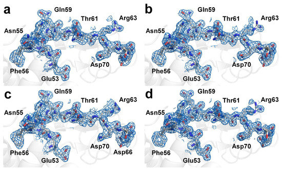 Next, the crystal structure of the lysozyme was determined from the multi- and single-crystal diffraction data. For the multicrystal diffraction data, the Rwork/Rfree values of the final 1.9 Å lysozyme structure indexed using XGANDALF and MOSFLM were 0.207/0.264 and 0.199/0.246, respectively. The overall electron density maps of the lysozyme obtained using XGANDALF and MOSFM were sufficiently clear for interpreting all the amino acids (Figure 4a,b). Concurrently, the refinement statistics for the model structure were different for XGANDALF and MOSFLM (Table 2). Meanwhile, although the data statistics for the multicrystal diffraction patterns processed using the XDS method were poor, these data were also used for structural determination. As expected, the Rwork and Rfree values of the 2.1 Å lysozyme structure in the case of XDS were 0.266 and 0.341, respectively, indicating that the model structure obtained using this method was not suitable (Figure 4c). For the single-crystal diffraction data, the Rwork/Rfree values of the final 1.6 Å lysozyme structure were 0.171 and 0.209, respectively. This dataset also exhibited clear electron density maps (Figure 4d), and almost all the amino acids were well defined.
