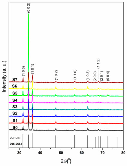 Additionally, from Table 1, it can be seen that in samples with different doping ratios, the (100), (002) and (101) characteristic peaks in particular have slightly higher 2θ values than the pristine sample. Such a shift indicates the presence of induced lattice stresses in the structures [59]. As a result of the Bragg formula, various factors such as impurities (dopant atoms), lattice defects, voids, or deformation faults can alter the interplanar distance, as a result of the lattice stress induced in the structure during the deposition process and can cause a shift towards a lower or higher angle [60].