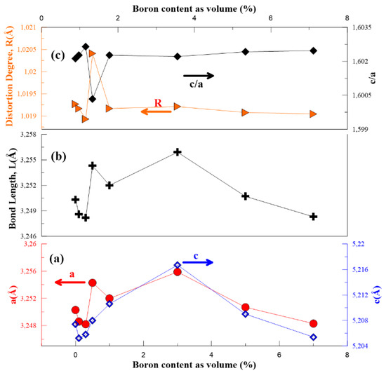 The variation in the (a) lattice parameters a and c, (b) Zn-O bond length, and (c) degree of lattice distortion and ratio as a function of boron content by volume.